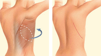 A latissimus dorsi flap uses muscle, fat and skin from the back tunneled to the mastectomy site and remains attached to its donor site, leaving blood supply intact.