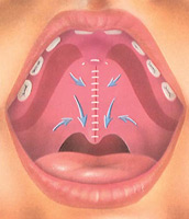 The repair of a cleft palate requires careful repositioning of tissue and muscles to close the cleft and rebuild the roof of the mouth. Incisions are made on either side of the cleft and specialized flap techniques are used to reposition the tissues of the hard and soft palate. This will include repositioning of the soft palate muscles used in speech. The repair is then stitched closed, generally along the midline of the roof of the mouth, providing enough length of the palate to allow for normal feeding, speech development and continued growth throughout life.